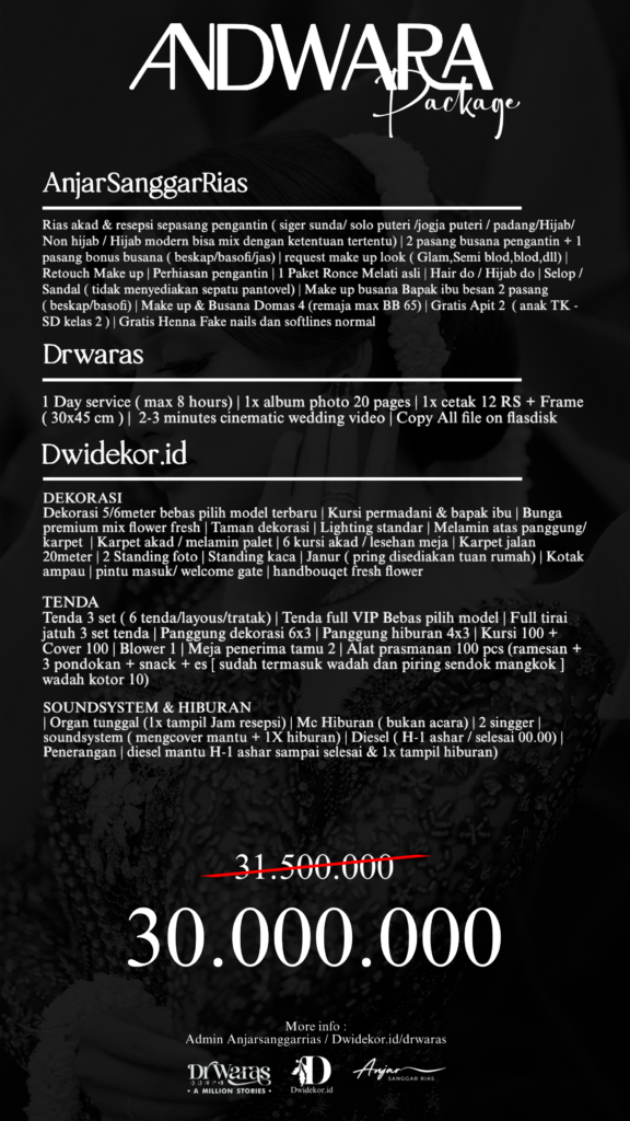 ANDWARA Package adalah paket wedding all in one yang dirancang untuk memudahkan Anda mewujudkan pernikahan impian tanpa ribet. Semua kebutuhan utama—mulai dari rias pengantin, dekorasi, hingga dokumentasi foto & video—sudah terintegrasi dalam satu paket praktis, sehingga Anda bisa lebih fokus menikmati momen spesial tanpa pusing mengatur banyak vendor.